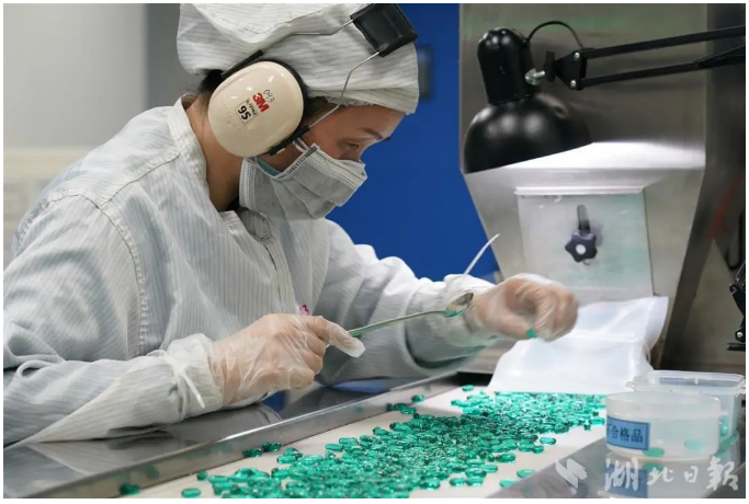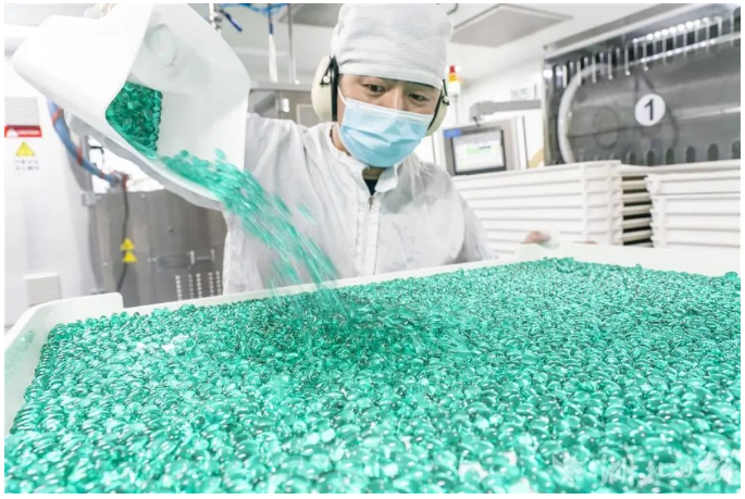 飛速運轉(zhuǎn)的生產(chǎn)線上,晶瑩剔透的綠色軟膠囊經(jīng)過壓丸、定型、干燥,隨后檢驗、灌瓶、裝箱。